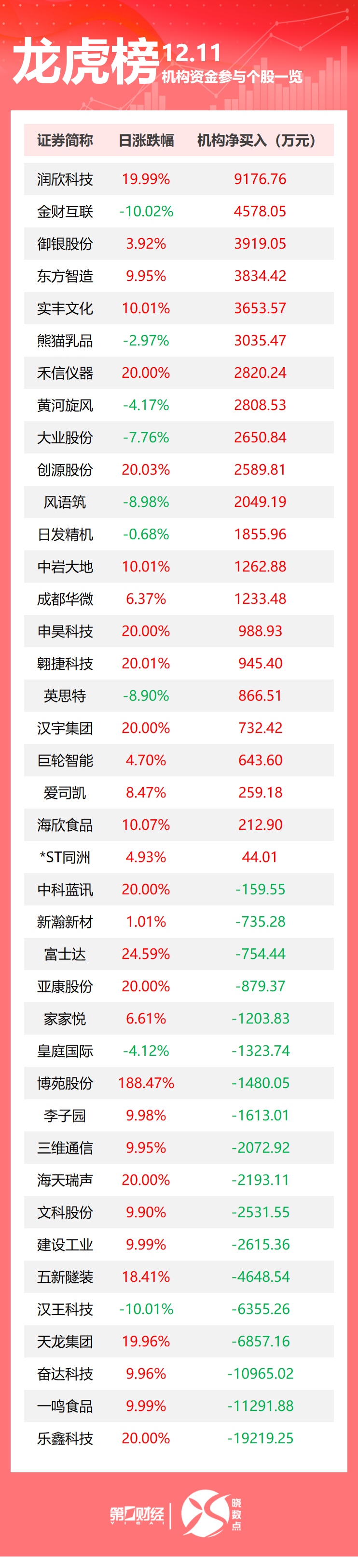 当天机构净买入前三的股票分别是润欣科技、金财互联、御银股份,净买入金额分别是9177万元、4578万元、3919万元。