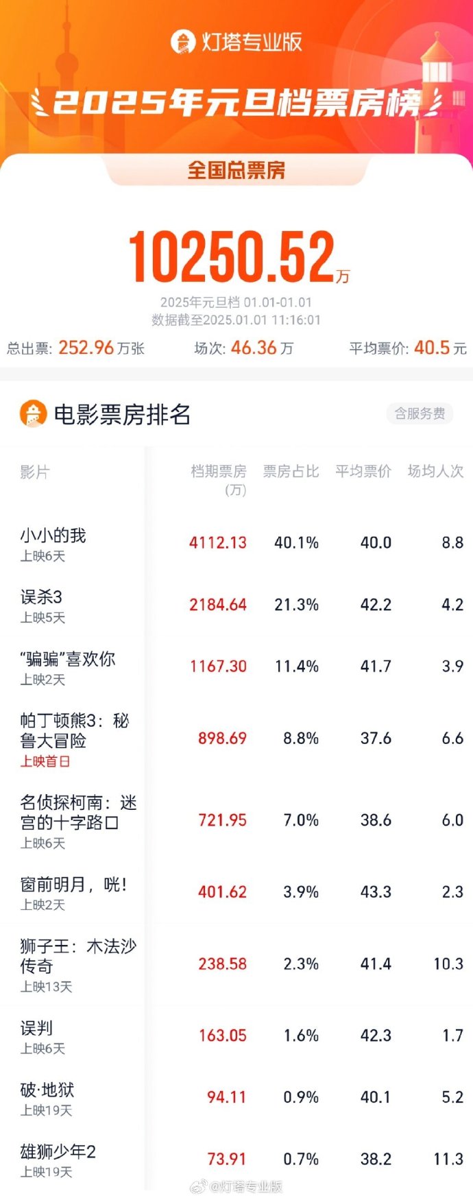 12:07【2025元旦档票房破亿】据灯塔专业版,截止11时16分,2025元旦档(1月1日)票房破亿,影片《小小的我》《误杀3》《“骗骗”喜欢你》暂列票房前三名。