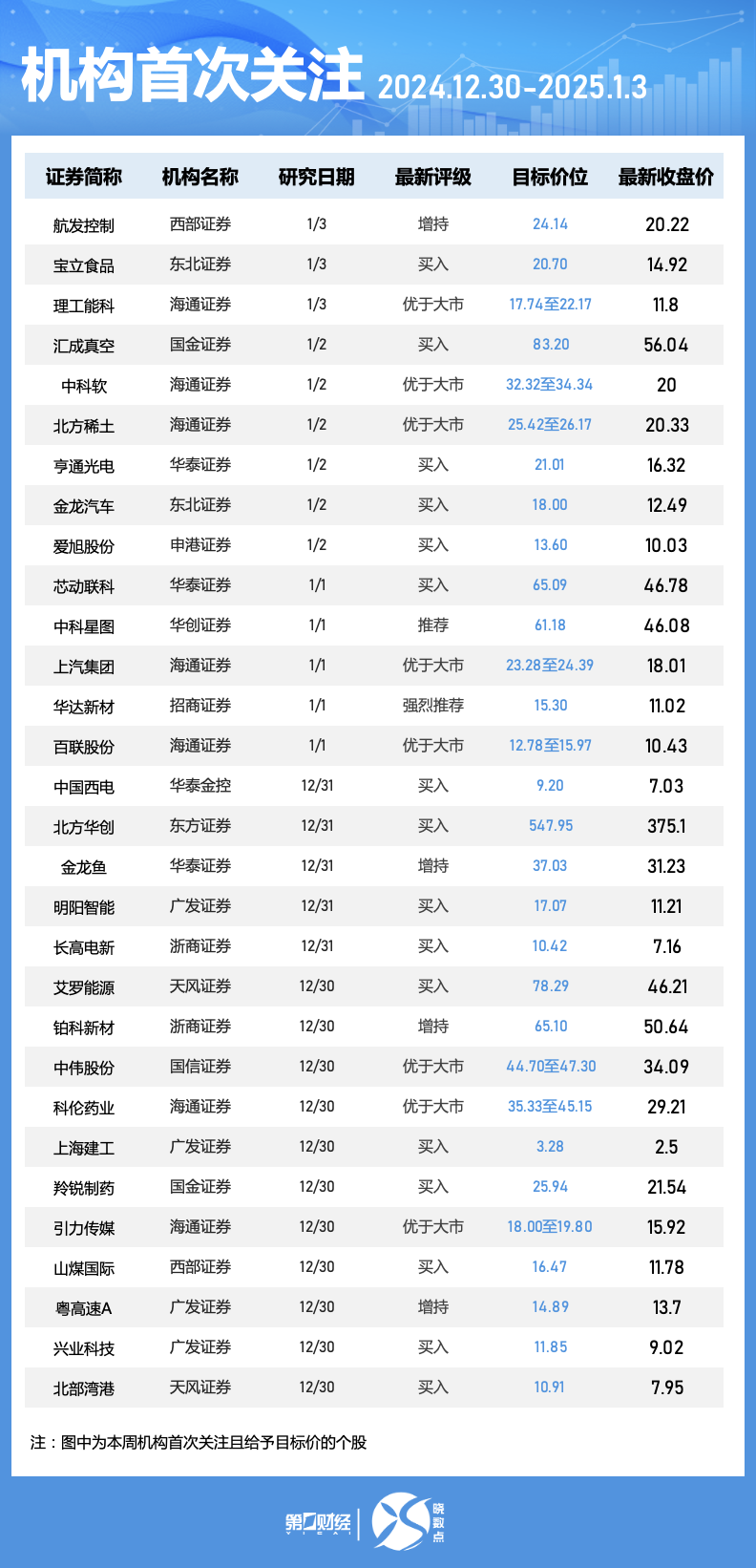 12:44【机构本周首次青睐79只个股】Wind数据显示,机构本周首次关注79只个股,31股被给予目标价。