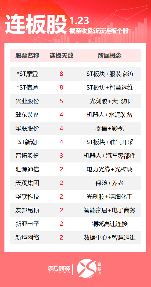 15:18【热市追踪丨A股今日共46只个股涨停 兴业股份收获5连板】1月23日,数据显示,A股市场共计46只个股涨停。其中光刻胶概念股兴业股份收获5连板,零售股华联股份4连板,机器人概念股晋拓股份3连板。一图速览今日连板股>>