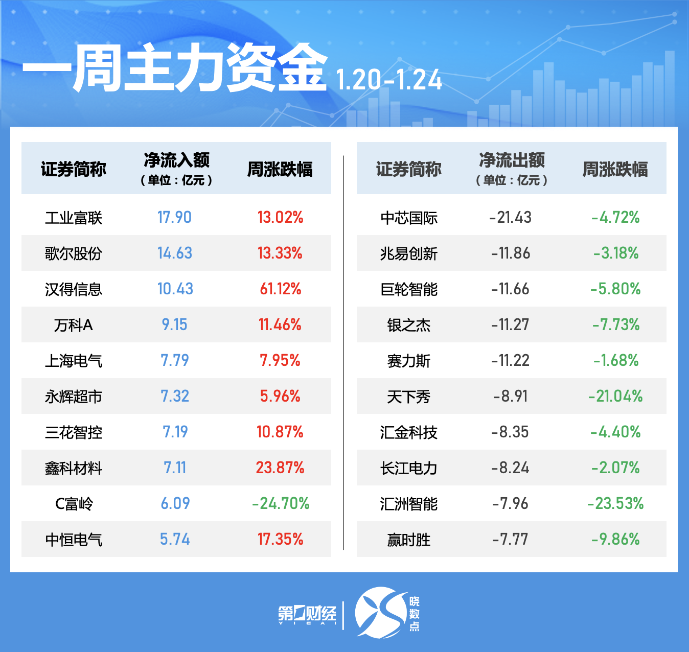 个股方面,本周工业富联、歌尔股份、汉得信息获主力净流入居前,分别为17.9亿元、14.63亿元、10.43亿元;净流出方面,中芯国际、兆易创新、巨轮智能分别遭主力净流出21.43亿元、11.86亿元、11.66亿元。
