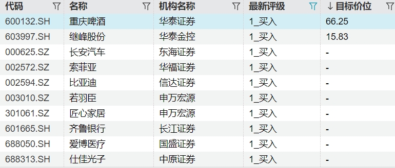 22:32【机构今日看好这些个股】2月7日,截至发稿,机构共给出10次最新买入评级,其中2只个股目标价获公布:-重庆啤酒获华泰证券看好,目标价为66.25元;-继峰股份获华泰金控青睐,目标价为15.83元;-比亚迪、齐鲁银行、爱博医疗等多股在列。