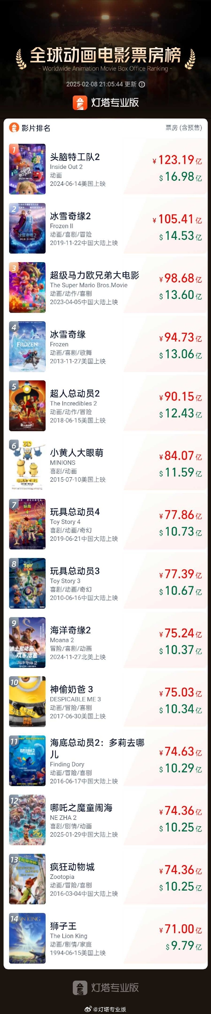 21:18【《哪吒2》超《疯狂动物城》 跻身全球动画电影票房榜前12名】据灯塔专业版全球票房榜,截至2月8日21时05分,影片《哪吒之魔童闹海》票房达74.36亿(含预售),超过《疯狂动物城》,进入全球票房榜前52名,全球动画电影票房榜前12名。