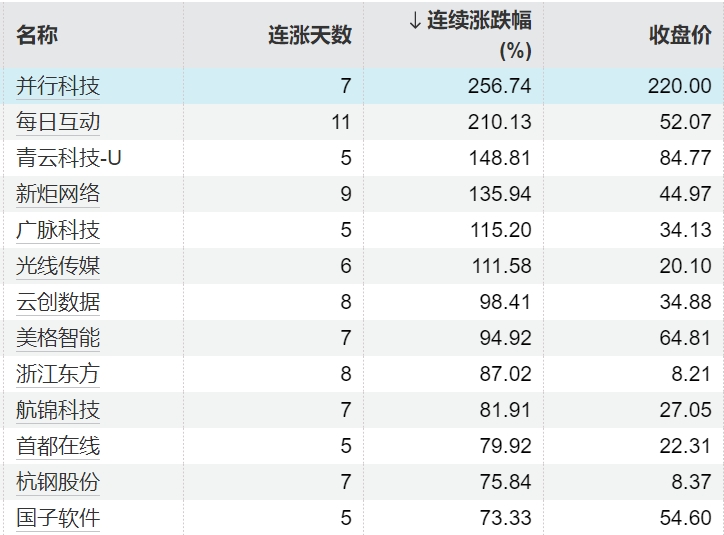 15:06【549只个股连续上涨5个交易日及以上】Wind数据显示,截至2月11日收盘,549只个股连续上涨5个交易日及以上。海康威视连续上涨13个交易日,天宇股份、天地数码等连续上涨12个交易日。从累计涨幅来看,并行科技连涨期间累计涨幅为256.74%,每日互动连涨期间累计涨幅为210.13%。
