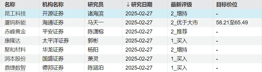 22:29【机构今日首次关注7只个股】Wind数据显示,机构今日首次关注7只个股,其中厦钨新能获海通证券给予“优于大市”评级,目标价为58.21至65.49元,该股最新收盘价为54.2元;赤峰黄金、康隆达、聚和材料等个股在列。