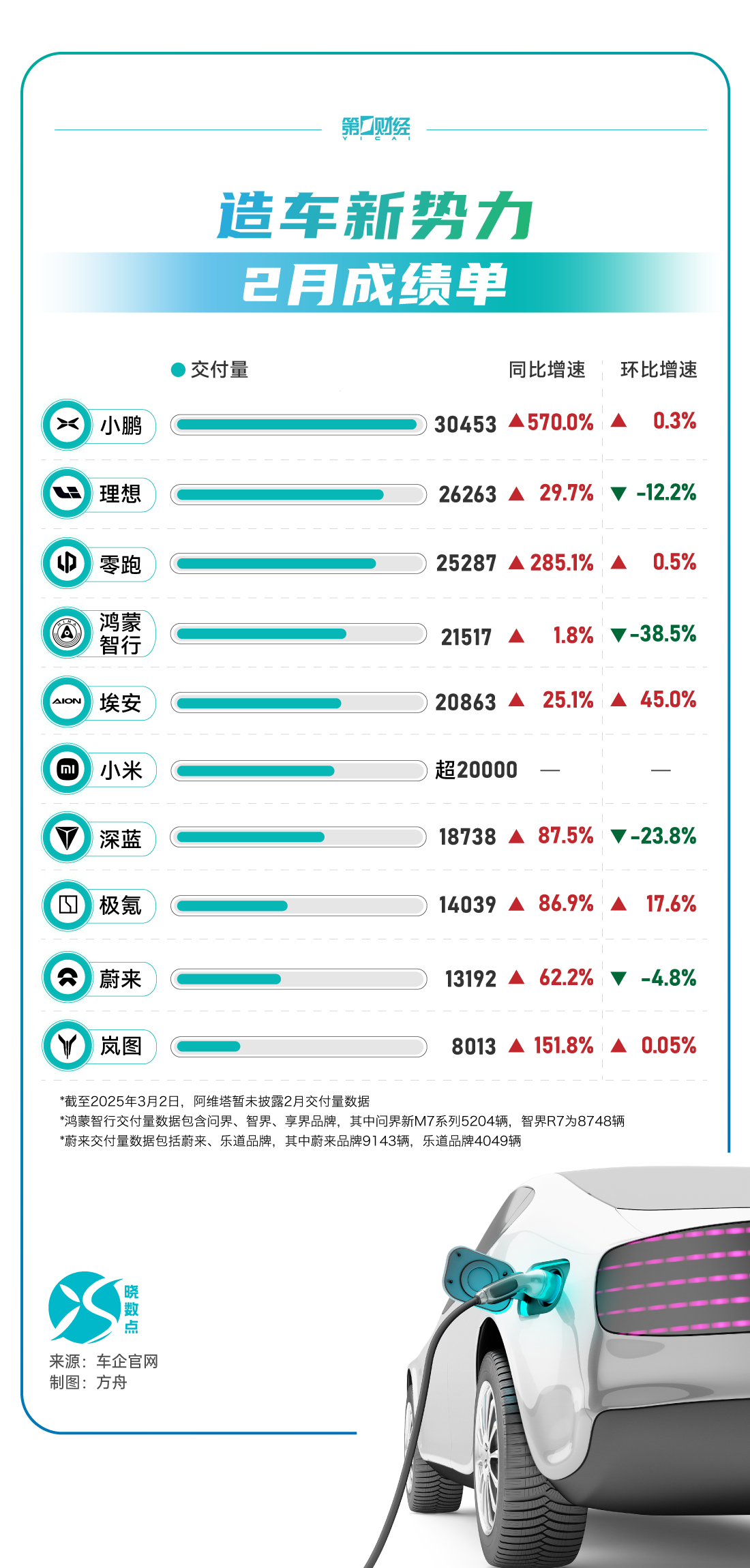 20:00【造车新势力2月成绩单出炉】小鹏交付量同比增超570%,小米连续5个月超2万辆。一图速览>>
