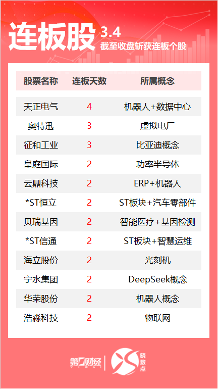 15:26【连板股追踪丨A股今日共88只个股涨停 天正电气4连板】3月4日,数据显示,A股市场共计88只个股涨停。其中机器人概念股天正电气4连板,虚拟电厂概念股奥特迅3连板。一图速览今日连板股>>