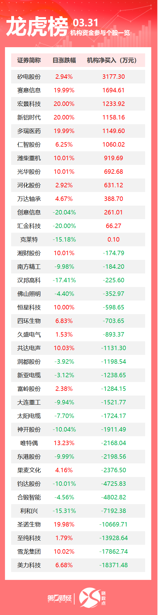 当天机构净买入前三的股票分别是矽电股份、赛意信息、宏景科技,净买入金额分别是3177万元、1695万元、1234万元。