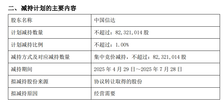 15:52【方正证券:中国信达拟减持公司不超过1%股份】方正证券公告,公司股东中国信达因经营需要,计划自本公告发布之日起十五个交易日后的三个月内,以集中竞价方式减持公司股份不超过8232.1万股,约占公司总股本的1.00%。减持期间为2025年4月29日至2025年7月28日。减持股份来源为协议转让取得。