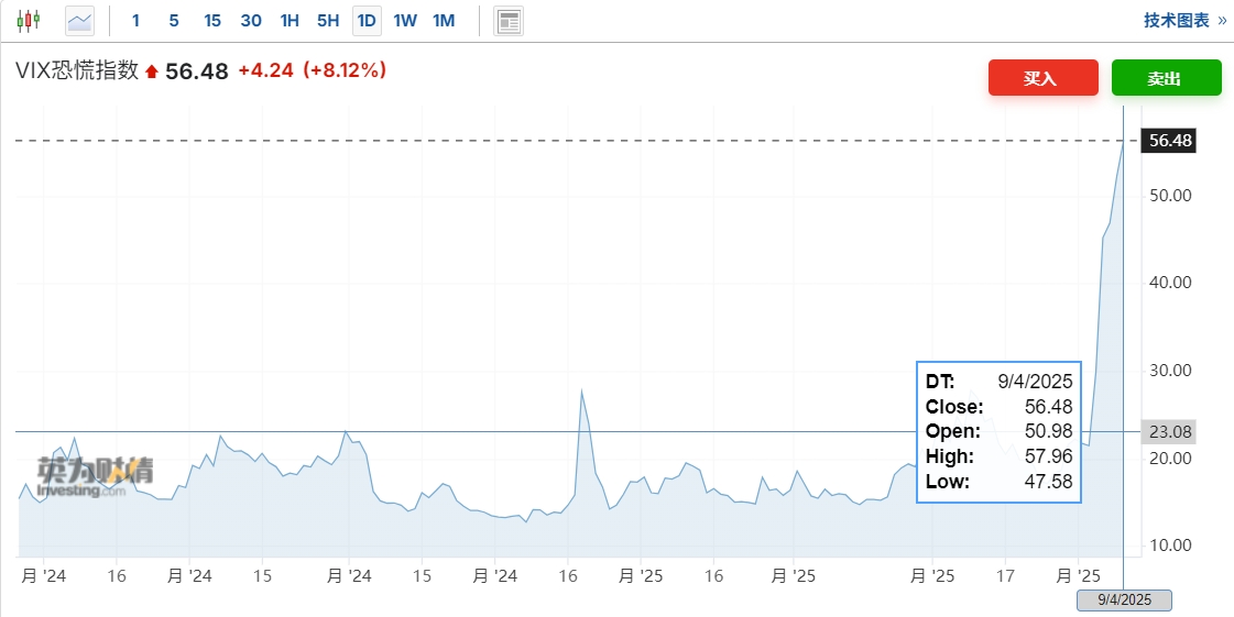 【恐慌指数VIX涨逾10%】恐慌指数VIX日内一度涨逾10%,最高报57.96。