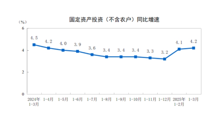 10:02【国家统计局:1—3月份全国固定资产投资同比增长4.2%】国家统计局数据显示,2025年1—3月份,全国固定资产投资(不含农户)103174亿元,同比增长4.2%(按可比口径计算,详见附注7),增速比1—2月份加快0.1个百分点。其中,民间固定资产投资同比增长0.4%,增速加快0.4个百分点。从环比看,3月份固定资产投资(不含农户)增长0.15%。