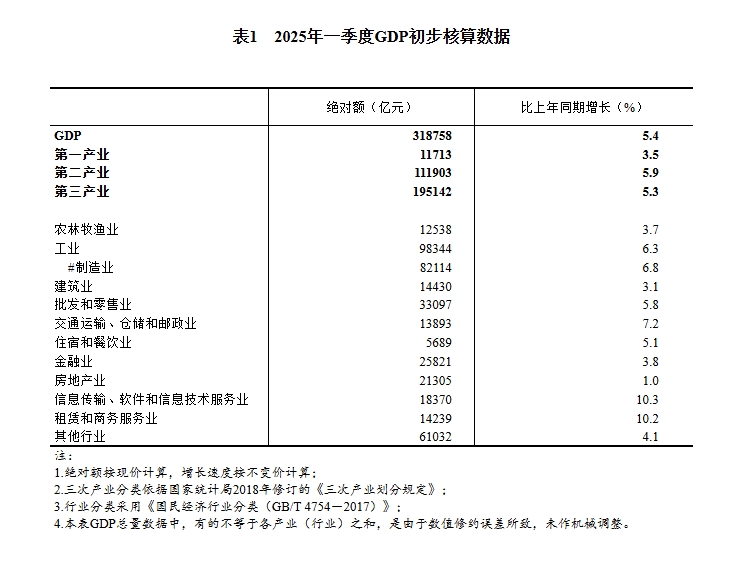 09:38【国家统计局:初步核算一季度国内生产总值同比增长5.4%】国家统计局发布2025年一季度国内生产总值初步核算结果,初步核算一季度国内生产总值同比增长5.4%。其中我国第一产业同比增长3.5%,第二产业同比增长5.9%,第三产业同比增长5.3%。