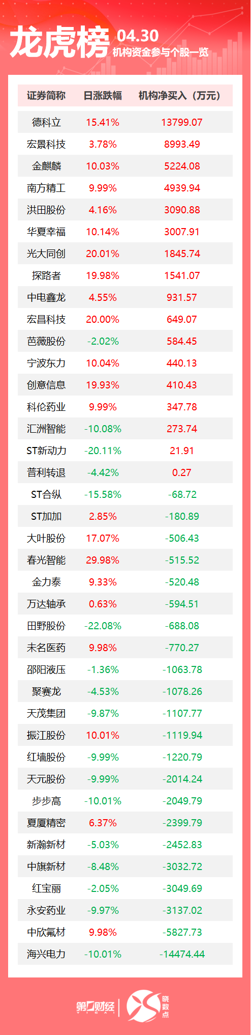 当天机构净买入前三的股票分别是德科立、宏景科技、金麒麟,净买入金额分别是1.38亿元、8993万元、5224万元。