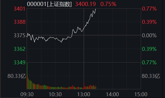 13:24【沪指突破3400点整数关口】上证指数突破3400点整数关口,涨0.75%,深证成指涨0.3%,创业板指涨0.5%。大金融板块发力,保险股领涨。(第一财经AI快讯)