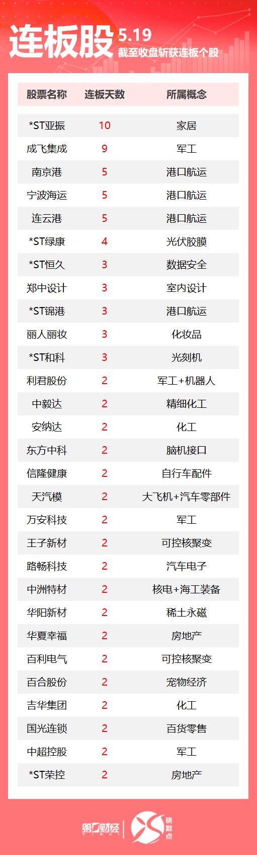 15:43【连板股追踪丨A股今日共121只个股涨停 成飞集成收获9连板】5月19日,Wind数据显示,A股市场共计121只个股涨停。其中军工股成飞集成收获9连板;港口航运板块多股连板,南京港、连云港、宁波海运均5连板。一图速览今日连板股>>