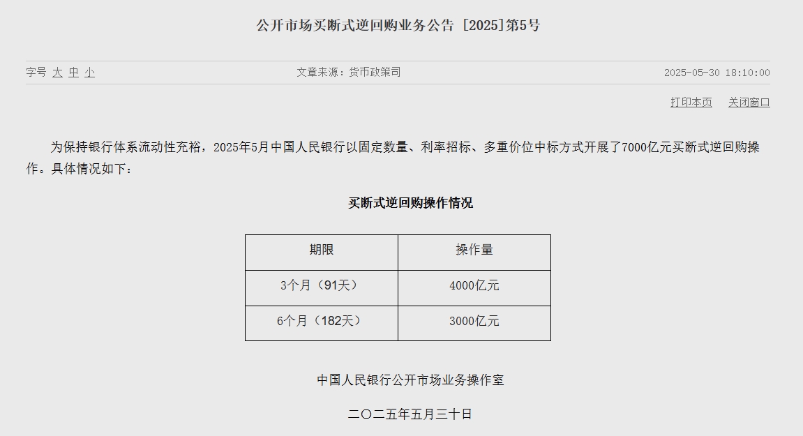 18:11【央行:5月开展了7000亿元买断式逆回购操作】据央行消息,为保持银行体系流动性充裕,2025年5月中国人民银行以固定数量、利率招标、多重价位中标方式开展了7000亿元买断式逆回购操作。具体情况如下: