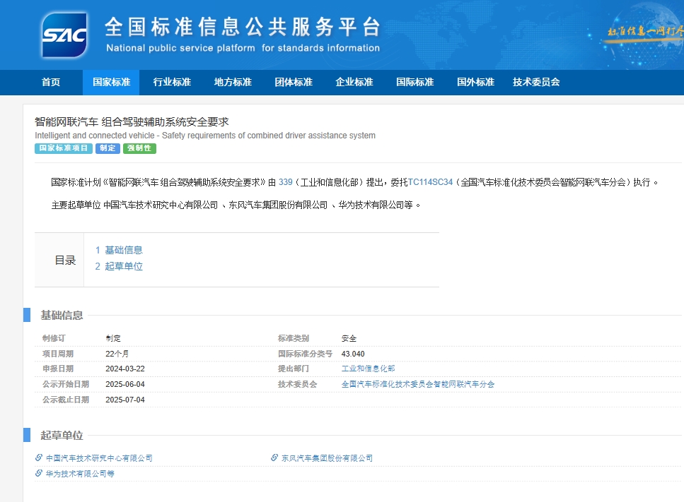 22:23【《智能网联汽车 组合驾驶辅助系统安全要求》立项制定】全国标准信息公共服务平台公示关于征求《智能网联汽车 组合驾驶辅助系统安全要求》拟立项强制性国家标准项目意见的通知。《智能网联汽车 组合驾驶辅助系统安全要求》由工业和信息化部提出,委托全国汽车标准化技术委员会智能网联汽车分会执行 。主要起草单位为中国汽车技术研究中心有限公司 、东风汽车集团股份有限公司 、华为技术有限公司等 。公示开始日期为2025年6月4日,公示截止日期为2025年7月4日。