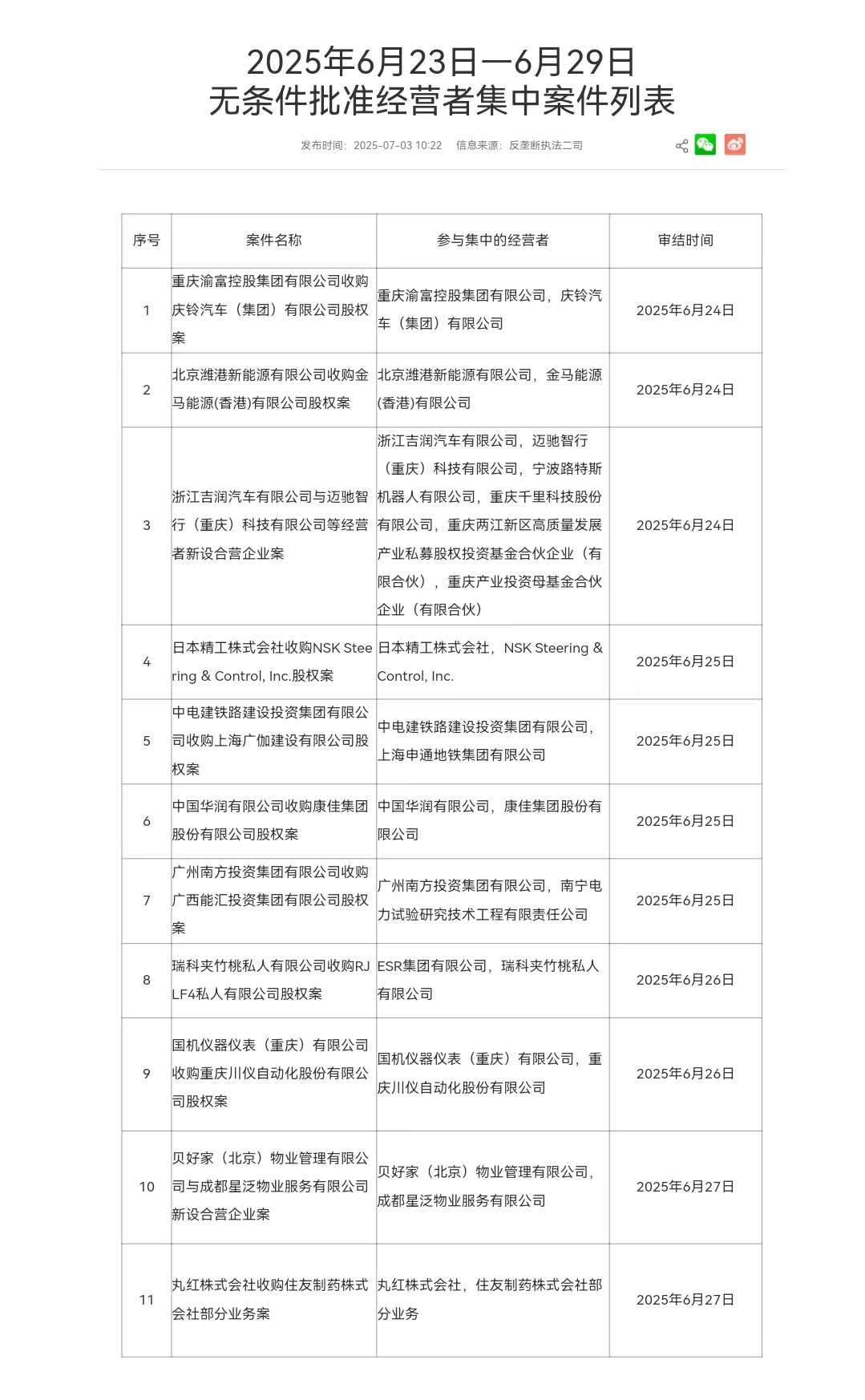 10:43【市场监管总局公布最新一批无条件批准经营者集中案件列表】市场监管总局公布2025年6月23日—6月29日无条件批准经营者集中案件列表,其中包括中国华润有限公司收购康佳集团股份有限公司股权案等。