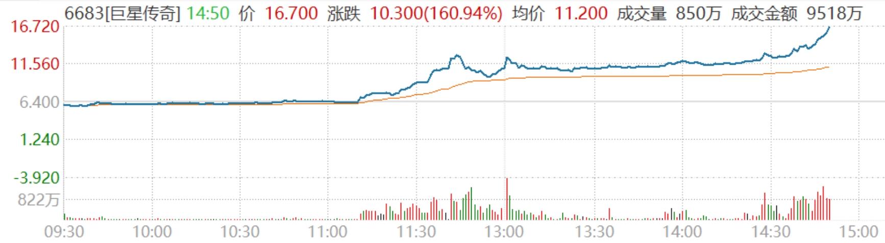 14:52【港股巨星传奇涨超160%】港股巨星传奇盘中再度拉升,现涨超160%。