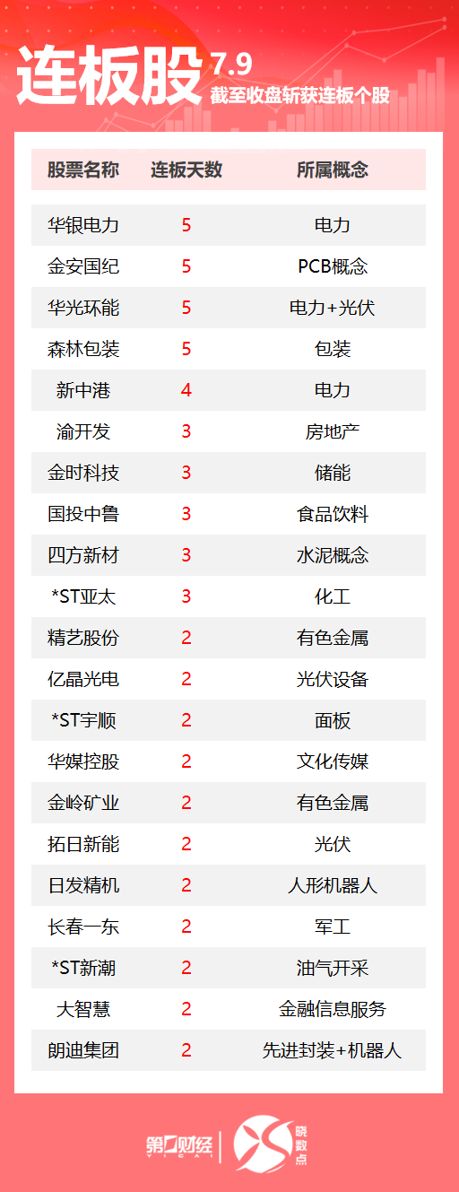 15:39【连板股追踪丨A股今日共61只个股涨停 电力板块多股连板】7月9日,Wind数据显示,A股市场共计61只个股涨停。其中电力板块多股连板,华银电力、华光环能均收获5连板,新中港4连板;地产股渝开发3连板。一图速览今日连板股>>