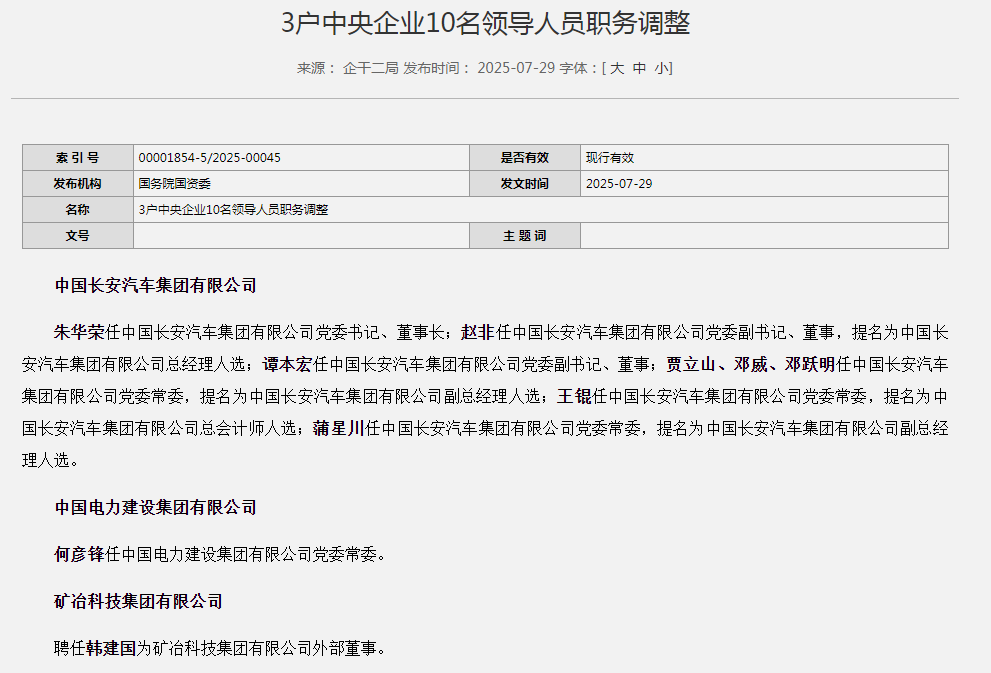 13:42【朱华荣任中国长安汽车集团有限公司党委书记、董事长】据国务院国资委官网,朱华荣任中国长安汽车集团有限公司党委书记、董事长;赵非任中国长安汽车集团有限公司党委副书记、董事,提名为中国长安汽车集团有限公司总经理人选;谭本宏任中国长安汽车集团有限公司党委副书记、董事;贾立山、邓威、邓跃明任中国长安汽车集团有限公司党委常委,提名为中国长安汽车集团有限公司副总经理人选;王锟任中国长安汽车集团有限公司党委常委,提名为中国长安汽车集团有限公司总会计师人选;蒲星川任中国长安汽车集团有限公司党委常委,提名为中国长安汽车集团有限公司副总经理人选。