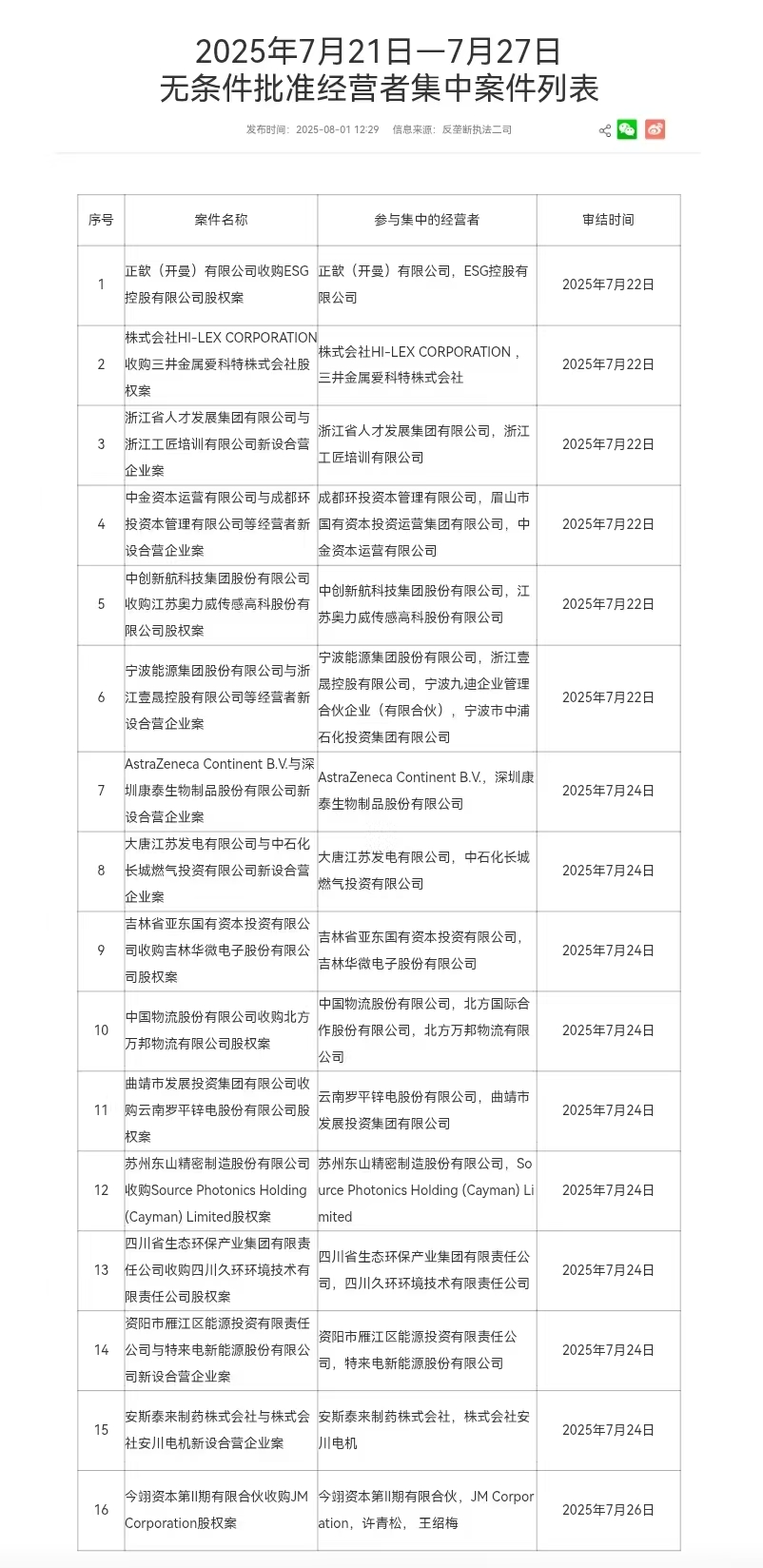 14:52【市场监管总局无条件批准中创新航收购苏奥传感股权案】市场监管总局公布2025年7月21日—7月27日无条件批准经营者集中案件列表,其中包括中创新航科技集团股份有限公司收购江苏奥力威传感高科股份有限公司股权案等。