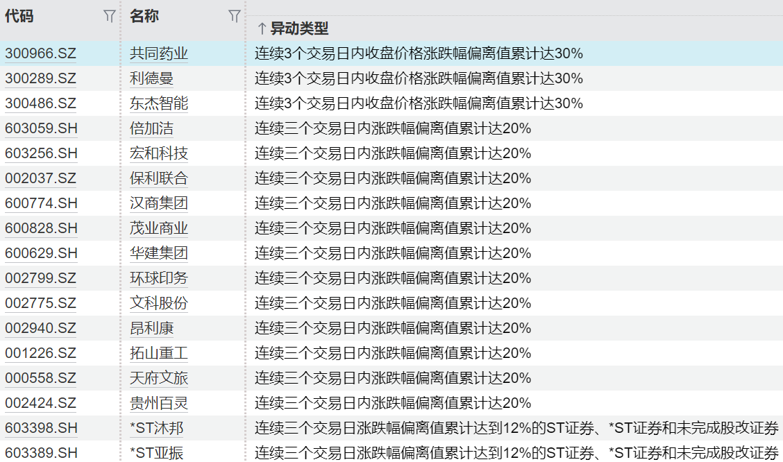 09:06【连续异动个股一览】截至8月4日,近日A股有17只个股连续异动2个交易日及以上。共同药业、利德曼、东杰智能连续3个交易日内收盘价格涨跌幅偏离值累计达30%。倍加洁、宏和科技、保利联合等连续三个交易日内涨跌幅偏离值累计达20%。*ST沐邦、*ST亚振连续三个交易日涨跌幅偏离值累计达到12%。