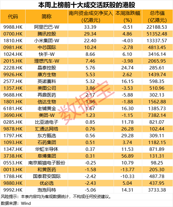 从成交净买入金额来看,大型科技股均获得南向资金加仓。其中,阿里巴巴-W本周获南向资金净买入金额最高,达到33.39亿港元,已连续4周获南向资金持股量增长,最新持股量为15.79亿股,占港股总股数的8.26%。另外腾讯控股、小米集团-W、中芯国际净买入金额均在10亿港元以上。