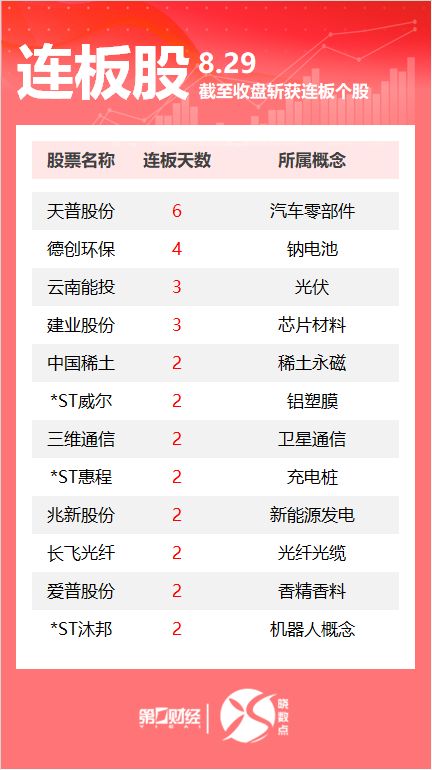 16:27【连板股追踪丨A股今日共80只个股涨停 天普股份收获6连板】8月29日,Wind数据显示,A股市场共计80只个股涨停。其中汽车零部件股天普股份收获6连板,钠离子股德创环保4连板。一图速览今日连板股>>