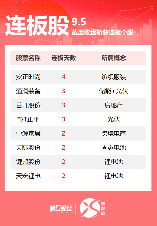 15:29【连板股追踪丨A股今日共108只个股涨停 光伏、电池板块多股连板】9月5日,Wind数据显示,A股市场共计108只个股涨停。其中纺织服装板块安正时尚收获4连板;光伏、电池板块多股连板,通润装备3连板,天际股份2连板。一图速览今日连板股>>
