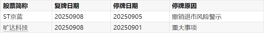 【A股复牌提示:2股今日复牌】Wind数据显示,9月8日,ST京蓝、旷达科技复牌。