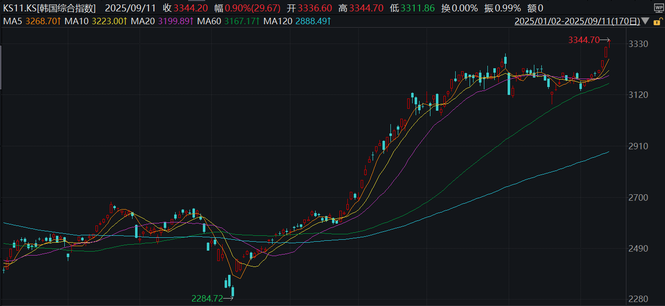 14:48【韩国综合指数续创收盘新高 年初至今涨近40%】韩国综合指数收涨0.9%,报3344.2点,续创收盘新高,今年年初至今涨幅高达近40%。韩国总统李在明今日在举行就职百日记者会时表示,韩国股市出现恢复势头。
