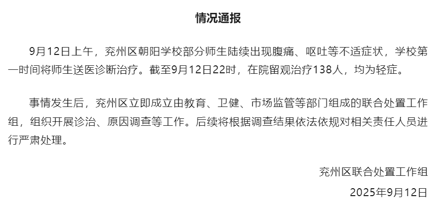 08:56【山东济宁兖州区通报一学校部分师生腹痛呕吐 138人在院留观均为轻症】山东省济宁市兖州区通报:9月12日上午,兖州区朝阳学校部分师生陆续出现腹痛、呕吐等不适症状,学校第一时间将师生送医诊断治疗。截至9月12日22时,在院留观治疗138人,均为轻症。