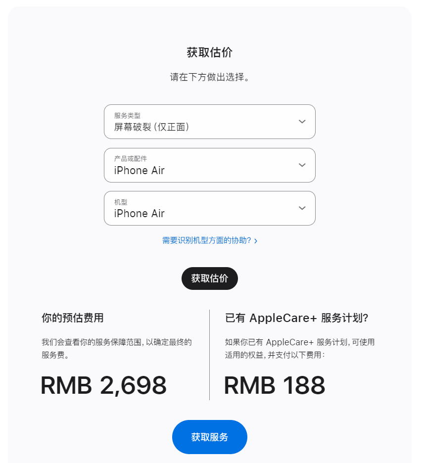 11:20【苹果iPhone Air维修预估费用公布:换屏2698元】苹果中国官网公布iPhone 17全系四款机型的保修期外维修费用。以iPhone Air为例:屏幕破裂预估维修费用为2698元、背面玻璃损坏1298元、屏幕破裂和背面玻璃损坏3429元、电池969元、后置相机1299元、其他损坏5699元。
