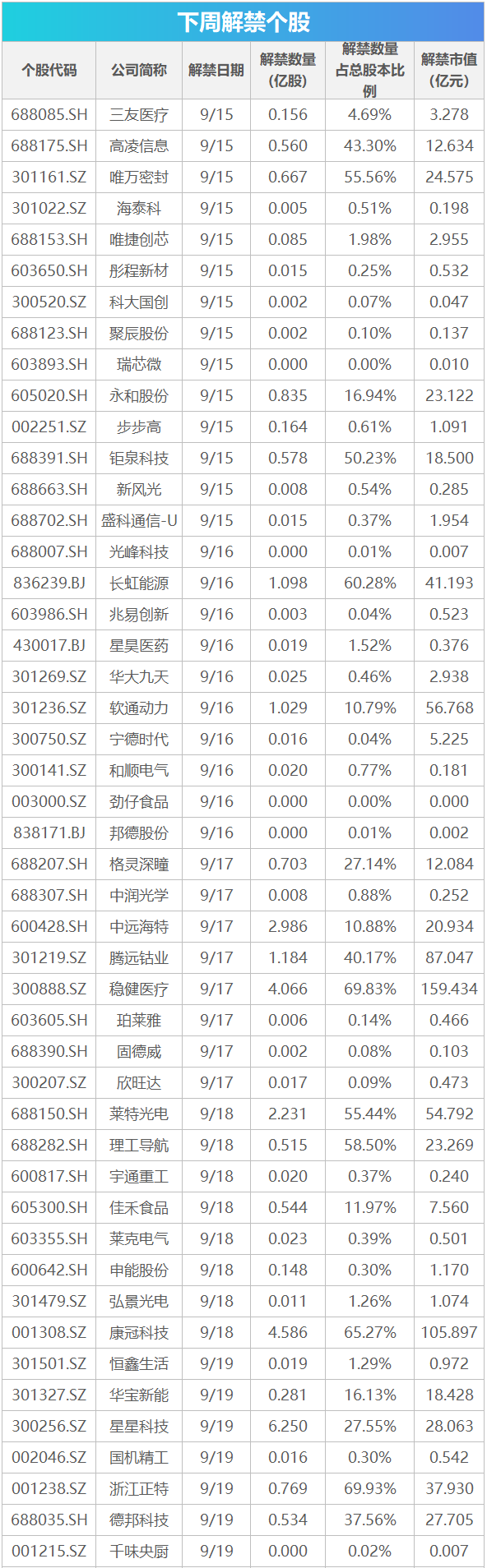 Wind数据显示,下周(9月15日至21日),A股市场将有47家上市公司迎来限售股解禁。以个股最新价计算,下周解禁股对应市值合计785.47亿元。从规模上看,17只个股解禁市值超过10亿元。稳健医疗、康冠科技解禁市值逾100亿元,分别为159.43亿元、105.9亿元。