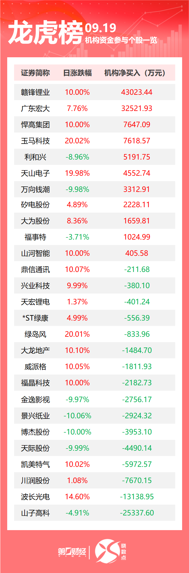 当天机构净买入前三的股票分别是赣锋锂业、广东宏大、悍高集团,净买入金额分别是4.3亿元、3.25亿元、7647万元。