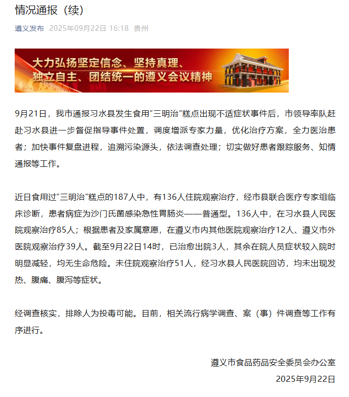 近日食用过“三明治”糕点的187人中,有136人住院观察治疗,经市县联合医疗专家组临床诊断,患者病症为沙门氏菌感染急性胃肠炎——普通型。136人中,在习水县人民医院观察治疗85人;根据患者及家属意愿,在遵义市内其他医院观察治疗12人、遵义市外医院观察治疗39人。截至9月22日14时,已治愈出院3人,其余在院人员症状较入院时明显减轻,均无生命危险。未住院观察治疗51人,经习水县人民医院回访,均未出现发热、腹痛、腹泻等症状。