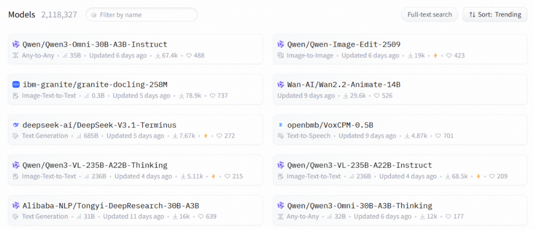 在刚刚结束的2025云栖大会上,阿里连发7款模型,引发海内外广泛关注。除Qwen3-Omni外,通义大模型家族中的视觉理解模型Qwen3-VL、图像编辑模型Qwen-Image-Edit-2509、动作生成模型Wan2.2-Animate、深度研究Agent模型DeepResearch等不同尺寸的6款模型,均入选Hugging Face全球开源榜单前十。