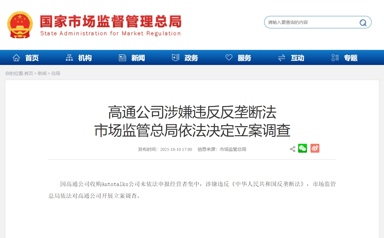 17:01【高通公司涉嫌违反反垄断法 市场监管总局依法决定立案调查】因高通公司收购Autotalks公司未依法申报经营者集中,涉嫌违反《中华人民共和国反垄断法》,市场监管总局依法对高通公司开展立案调查。