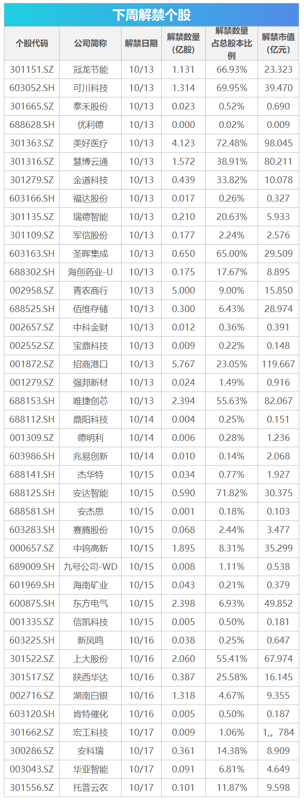 下周将有40股解禁,招商港口下周将有5.77亿股上市流通,主要为定向增发机构配售股份,解禁市值达119.67亿元。美好医疗下周将有4.12亿股上市流通,解禁股主要为首发原股东限售股份,解禁市值达98.04亿元。从解禁比例来看,美好医疗、安达智能、可川科技、冠龙节能等7股的解禁比例居前,均超50%。