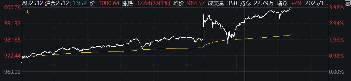 13:52【沪金主力合约突破1000元整数关口】沪金主力合约强势突破1000元整数关口,日内涨近4%,续创历史新高,年内涨超370元,涨幅超60%。