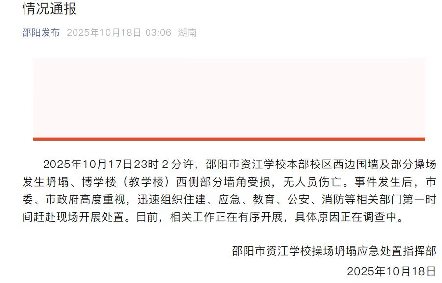 10:22【邵阳市资江学校围墙及部分操场坍塌 官方通报】邵阳市资江学校操场坍塌应急处置指挥部10月18日发布情况通报称,2025年10月17日23时2分许,邵阳市资江学校本部校区西边围墙及部分操场发生坍塌、博学楼(教学楼)西侧部分墙角受损,无人员伤亡。事件发生后,市委、市政府高度重视,迅速组织住建、应急、教育、公安、消防等相关部门第一时间赶赴现场开展处置。目前,相关工作正在有序开展,具体原因正在调查中。