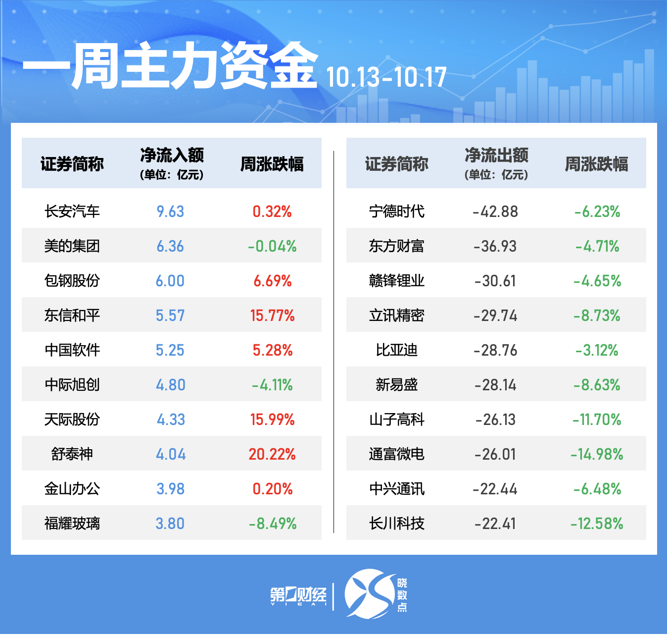 个股方面,本周长安汽车、美的集团、包钢股份获主力净流入居前,分别为9.63亿元、6.36亿元、6亿元;净流出方面,宁德时代、东方财富、赣锋锂业分别遭主力净流出42.88亿元、36.93 亿元、30.61亿元。