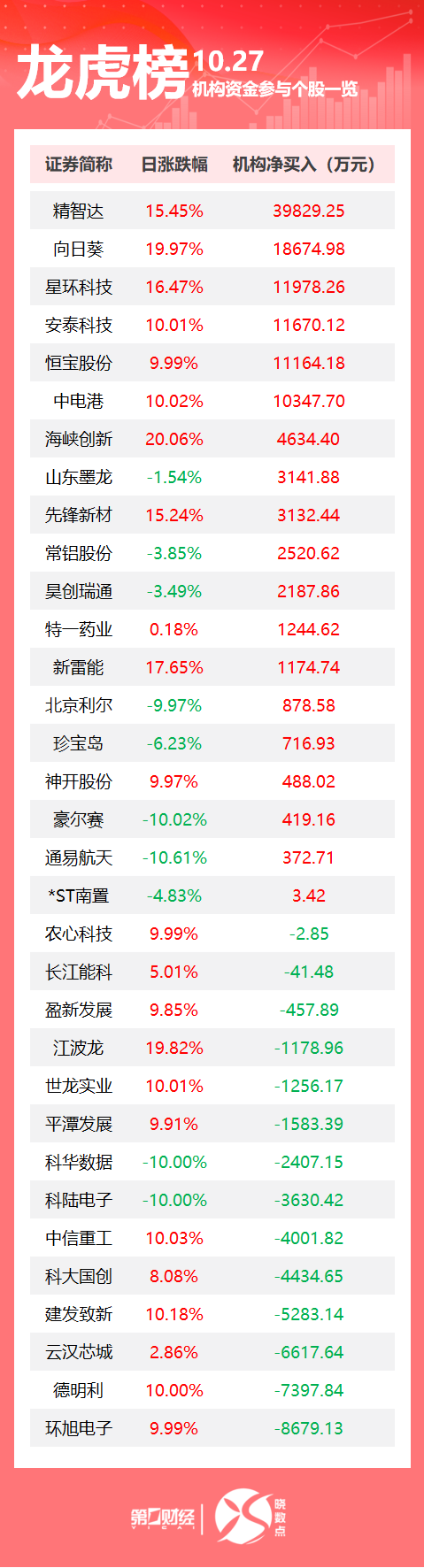 当天机构净买入前三的股票分别是精智达、向日葵、星环科技,净买入金额分别是3.98亿元、1.87亿元、1.20亿元。