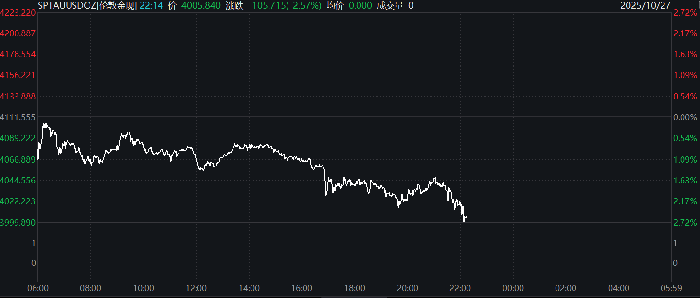 【现货黄金向下触及4000美元/盎司】现货黄金向下触及4000美元/盎司,日内跌幅扩大至2.7%。