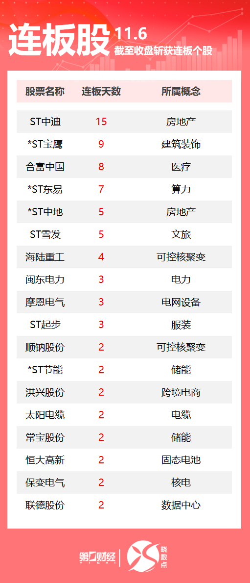 15:44【连板股追踪丨A股今日共72只个股涨停 合富中国8连板】11月6日,Wind数据显示,A股市场共计72只个股涨停。其中医疗股合富中国收获8连板,可控核聚变概念股海陆重工4连板,电力板块闽东电力3连板。一图速览今日连板股>>