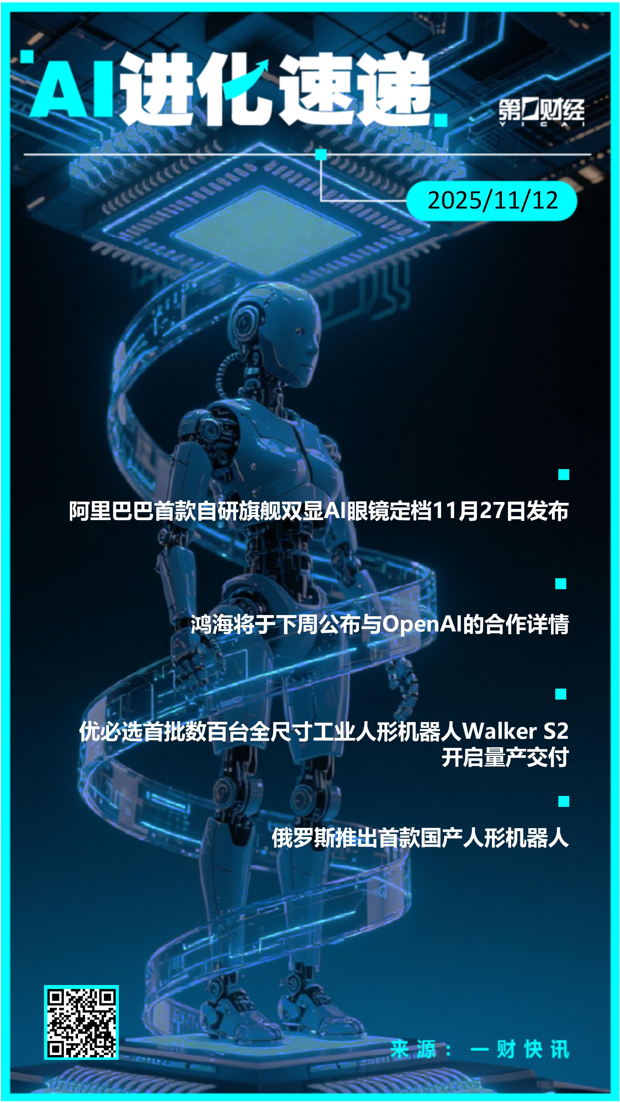 20:44【AI进化速递丨俄罗斯推出首款国产人形机器人】①阿里巴巴首款自研旗舰双显AI眼镜定档11月27日发布;②鸿海:将于下周公布与OpenAI的合作详情;③优必选首批数百台全尺寸工业人形机器人Walker S2开启量产交付;④俄罗斯推出首款国产人形机器人。