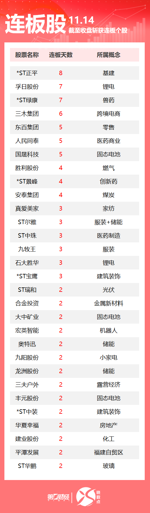 15:35【连板股追踪丨A股今日共90只个股涨停 锂电股孚日股份7连板】11月14日,Wind数据显示,A股市场共计90只个股涨停。其中锂电股孚日股份收获7连板,医药商业板块人民同泰5连板,燃气股胜利股份4连板。一图速览今日连板股>>