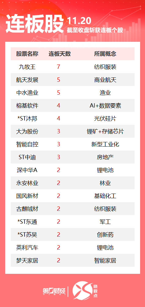 15:46【连板股追踪丨A股今日共49只个股涨停 这只股走出“天地天板”】11月20日,Wind数据显示,A股市场共计49只个股涨停。其中纺织服装板块九牧王7连板,日内上演“天地天板”行情;商业航天板块航天发展5连板。一图速览今日连板股>>