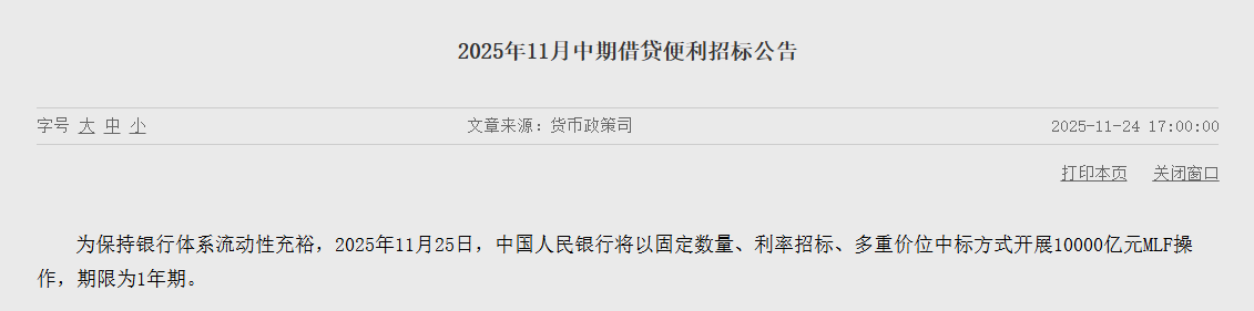 17:10【央行:11月25日将开展10000亿元MLF操作 期限为1年期】据央行消息,为保持银行体系流动性充裕,2025年11月25日,中国人民银行将以固定数量、利率招标、多重价位中标方式开展10000亿元MLF操作,期限为1年期。